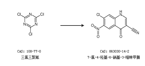 1.通过三氯三聚氰合成7-氯-4-羟基-6-硝基-3-喹啉甲腈