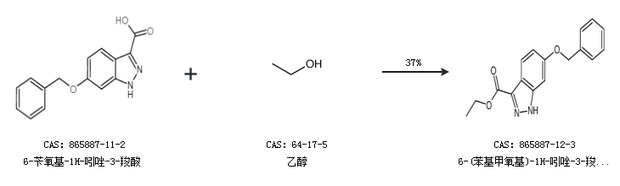1.通过6-苄氧基-1H-吲唑-3-羧酸和乙醇合成6-(苯基甲氧基)-1H-吲唑-3-羧酸乙酯,收率约37%;