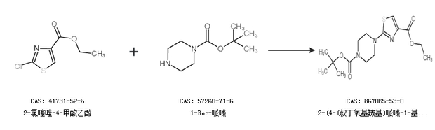 1.通过2-氯噻唑-4-甲酸乙酯和1-Boc-哌嗪合成2-(4-(叔丁氧基羰基)哌嗪-1-基)噻唑-4-羧酸乙酯