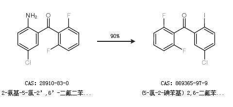 1.通过2-氨基-5-氯-2’,6’-二氟二苯甲酮合成(5-氯-2-碘苯基) 2,6-二氟苯甲烷,收率约90%;