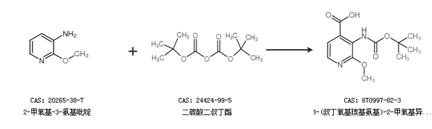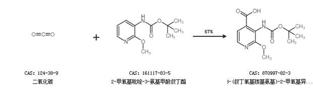 1.通过二氧化碳和2-甲氧基吡啶-3-氨基甲酸叔丁酯合成3-(叔丁氧基羰基氨基)-2-甲氧基异烟酸甲酯,收率约67%;