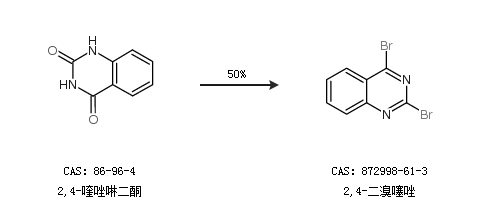 1.通过2,4-喹唑啉二酮合成2,4-二溴噻唑,收率约50%;