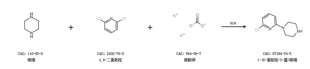 1.通过哌嗪、2,6-二氯吡啶和碳酸钾合成1-(6-氯吡啶-2-基)哌嗪,收率约91%;