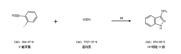 2.通过2-氟苯腈和高纯氮合成1H-吲唑-3-胺,收率约9%;