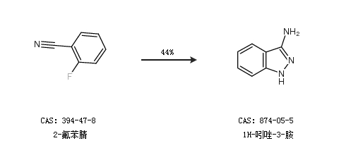 1.通过2-氟苯腈合成1H-吲唑-3-胺,收率约44%;