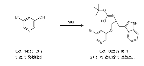 1.通过3-溴-5-羟基吡啶合成(S)-1-(5-溴吡啶-3-基氧基)-3-(1H-吲哚-3-基)丙烷-2-氨基甲酸叔丁酯,收率约90%;