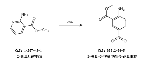 1.通过2-氨基烟酸甲酯合成2-氨基-3-羧酸甲酯-5-硝基吡啶,收率约34%;