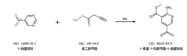 2.通过5-硝基嘧啶和氰乙酸甲酯合成2-氨基-3-羧酸甲酯-5-硝基吡啶,收率约26%;