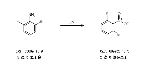 1.通过2-溴-6-氟苯胺合成2-溴-6-氟硝基苯,收率约86%;