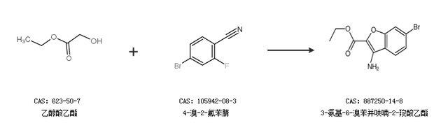 1.通过乙醇酸乙酯和4-溴-2-氟苯腈合成3-氨基-6-溴苯并呋喃-2-羧酸乙酯