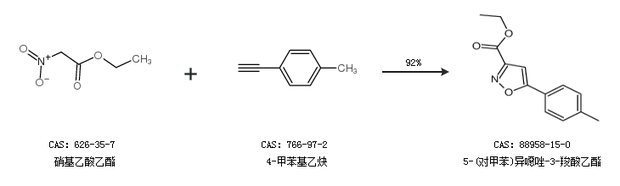 1.通过硝基乙酸乙酯和4-甲苯基乙炔合成5-(对甲苯)异噁唑-3-羧酸乙酯,收率约92%;
