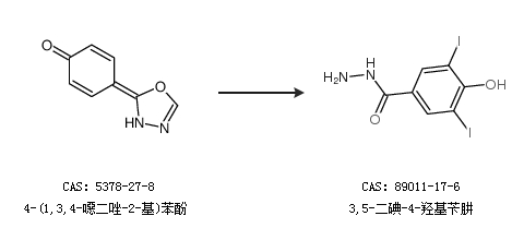 1.通过4-(1,3,4-噁二唑-2-基)苯酚合成3,5-二碘-4-羟基苄肼