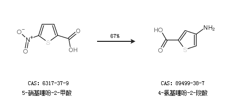 1.通过5-硝基噻吩-2-甲酸合成4-氨基噻吩-2-羧酸,收率约67%;