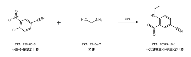 2.通过4-氯-3-硝基苯甲腈和乙胺合成4-乙基氨基-3-硝基-苯甲腈,收率约91%;