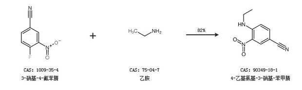 1.通过3-硝基-4-氟苯腈和乙胺合成4-乙基氨基-3-硝基-苯甲腈,收率约82%;