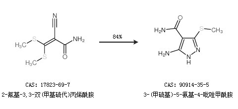 2.通过2-氰基-3,3-双(甲基硫代)丙烯酰胺合成3-(甲硫基)-5-氨基-4-吡唑甲酰胺,收率约84%;