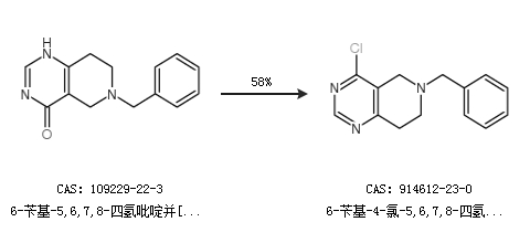 1.通过6-苄基-5,6,7,8-四氢吡啶并[4,3-d]嘧啶-4(3H)-酮合成6-苄基-4-氯-5,6,7,8-四氢吡啶并[4,3-d]嘧啶,收率约58%;