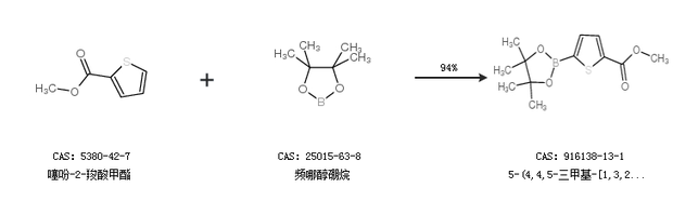 1.通过噻吩-2-羧酸甲酯和频哪醇硼烷合成5-(4,4,5-三甲基-[1,3,2]二氧硼戊环-2-基)-噻吩-2-甲酸甲酯,收率约94%;