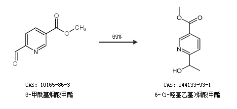 1.通过6-甲酰基烟酸甲酯合成6-(1-羟基乙基)烟酸甲酯,收率约69%;