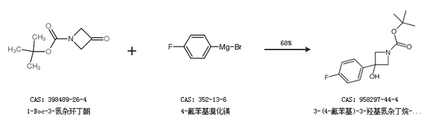 1.通过1-Boc-3-氮杂环丁酮和4-氟苯基溴化镁合成3-(4-氟苯基)-3-羟基氮杂丁烷-1-羧酸叔丁酯,收率约68%;