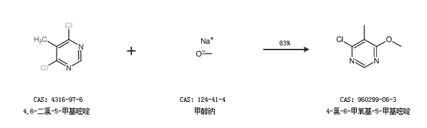 1.通过4,6-二氯-5-甲基嘧啶和甲醇钠合成4-氯-6-甲氧基-5-甲基嘧啶,收率约83%;