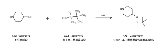 1.通过4-羟基哌啶和叔丁基二甲基氯硅烷合成4-(叔丁基二甲基甲硅烷基氧基)哌啶,收率约86%;