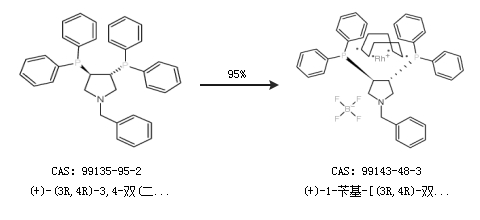 1.通过(+)-(3R,4R)-3,4-双(二苯基膦)-1-苄基吡咯烷合成(+)-1-苄基-[(3R,4R)-双(二苯基膦)]吡咯烷(1,5-环辛二烯)四氟硼酸铑(I),收率约95%;