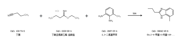 1.通过丁腈、丁酰亚氨酸乙酯 盐酸盐和2,3-二氨基甲苯合成(9ci)-4-甲基-2-丙基-1H-苯并咪唑,收率约56%;