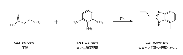 2.通过丁酸和2,3-二氨基甲苯合成(9ci)-4-甲基-2-丙基-1H-苯并咪唑,收率约57%;