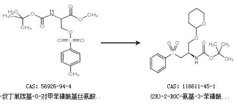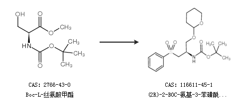 英文别名 tert-butyl N-[(2R)-1-(benzenesulfonyl)-3-[(2S)-oxan-2-yl]oxy-propan-2-yl]carbamate;TERT-BUTYL N-[(2R)-1-(BENZENESULFONYL)-3-[(2R)-OXAN-2-YL]OXY-PROPAN-2-YL]CARBAMATE;(2R)-2-t-butoxycarbonylamino-3-phenylsulfonyl-1-(2-tetrahydropyranyloxy)propane;(2R)-2-BOC-AMINO-3-PHENYLSULFONYL-1-(2-TETRAHYDROPYRANYLOXY)PROPANE;(2R)-2-Boc-amino-3-phenylsulfonyl-1-(2-tetrahydropyranyloxy)propane;