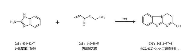 1.通过2-氨基苯并咪唑和丙烯酸乙酯合成(8CI,9CI)-3,4-二氢嘧啶并[1,2-a]苯并咪唑-2(1H)-酮,收率约74%;