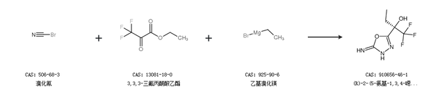2.通过溴化氰、3,3,3-三氟丙酮酸乙酯和乙基溴化镁合成(R)-2-(5-氨基-1,3,4-噁二唑-2-基)-1,1,1-三氟-2-丁醇
