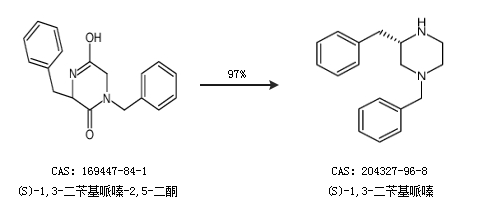 1.通过(S)-1,3-二苄基哌嗪-2,5-二酮合成(S)-1,3-二苄基哌嗪,收率约97%;