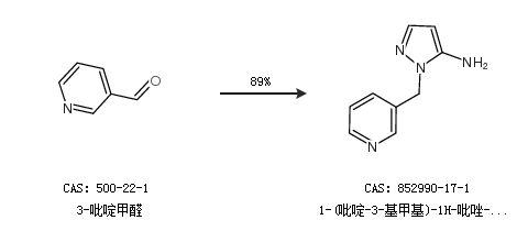 1.通过3-吡啶甲醛合成1-(吡啶-3-基甲基)-1H-吡唑-5-胺,收率约89%;