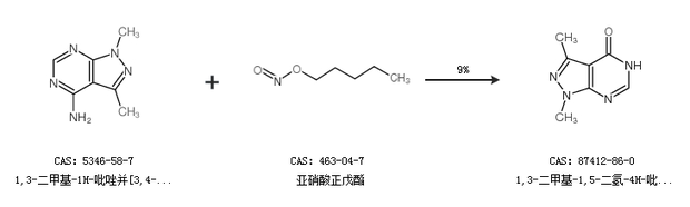 2.通过1,3-二甲基-1H-吡唑并[3,4-d]嘧啶-4-胺和亚硝酸正戊酯合成1,3-二甲基-1,5-二氢-4H-吡唑并-[3,4-d]嘧啶-4-酮,收率约9%;