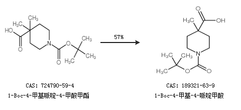 2.通过1-Boc-4-甲基哌啶-4-甲酸甲酯合成1-Boc-4-甲基-4-哌啶甲酸,收率约57%;