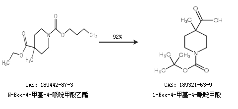 1.通过N-Boc-4-甲基-4-哌啶甲酸乙酯合成1-Boc-4-甲基-4-哌啶甲酸,收率约92%;