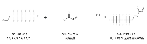 2.通过3,3,4,4,5,5,6,6,7,7,8,8,8-十三氟-1-辛醇和丙烯酰氯合成1H,1H,2H,2H-全氟辛醇丙烯酸酯,收率约87%;