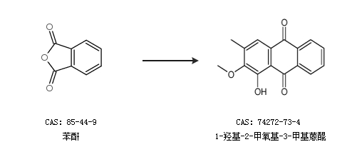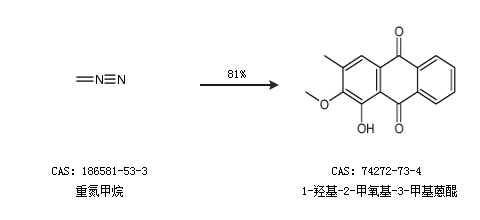 1.通过重氮甲烷合成1-羟基-2-甲氧基-3-甲基蒽醌,收率约81%;