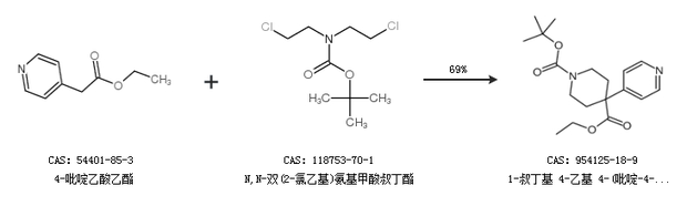 1.通过4-吡啶乙酸乙酯和N,N-双(2-氯乙基)氨基甲酸叔丁酯合成1-叔丁基 4-乙基 4-(吡啶-4-基)哌啶-1,4-二羧酸,收率约69%;