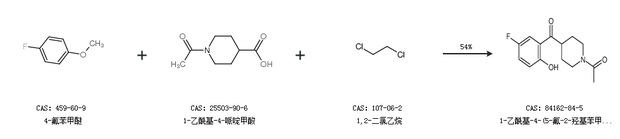1.通过4-氟苯甲醚、1-乙酰基-4-哌啶甲酸和1,2-二氯乙烷合成1-乙酰基-4-(5-氟-2-羟基苯甲酰基)哌啶,收率约54%;