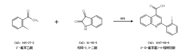 1.通过2''-氟苯乙酮和吲哚-2,3-二酮合成2-(2-氟苯基)-4-喹啉羧酸,收率约86%;
