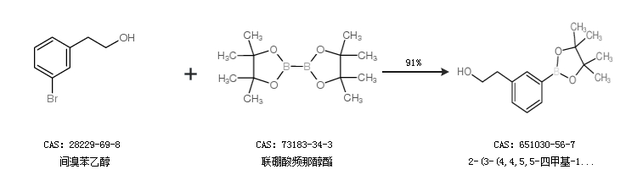 1.通过间溴苯乙醇和联硼酸频那醇酯合成2-(3-(4,4,5,5-四甲基-1,3,2-二噁硼烷-2-基)苯基)乙醇,收率约91%;