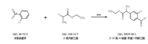 1.通过邻氯硝基苯和2-氯丙酸乙酯合成2-(3-氯-4-硝基-苯基)-丙酸乙酯,收率约83%;