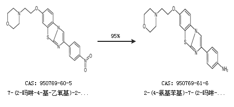 1.通过7-(2-吗啉-4-基-乙氧基)-2-(4-硝基苯基)咪唑并[2,1-b][1,3]-苯并噻唑合成2-(4-氨基苯基)-7-(2-吗啉-4-基-乙氧基)咪唑并[2,1-b]-[1,3]苯并噻唑,收率约95%;