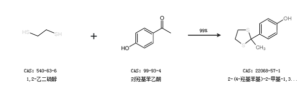 1.通过1,2-乙二硫醇和对羟基苯乙酮合成2-(4-羟基苯基)-2-甲基-1,3-二硫烷,收率约99%;