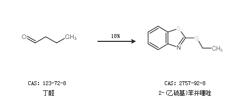 2.通过丁醛合成2-(乙硫基)苯并噻唑,收率约18%;