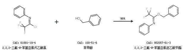 1.通过2,2,2-三氟-N-苯基亚氨代乙酰氯和苯甲醇合成2,2,2-三氟-N-苯基亚氨逐乙酸苄酯,收率约96%;