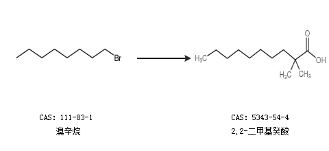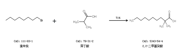 1.通过溴辛烷和异丁酸合成2,2-二甲基癸酸,收率约71%;