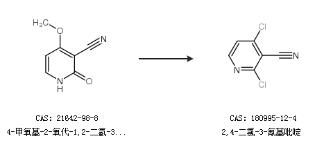英文别名 2,4-Dichlor-nicotinonitril;2,4-dichloro-3-cyanopyridine;4,6-dichloro-5-cyanopyridine;2,4-Dichloro-3-Pyridinecarbonitrile;2,4-Dichloronicotinonitrile;2,4-Dichlorocarbonitrile;3-Cyano-2,4-dichloropyridine;
